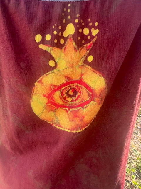 Ace of Cups Pip card from Tarot of the Pomegranate hand painted on this 2XL (12-16) Cami with built in shelf bra. 100% Cotton. On the back of this soft comfy cami we have a golden pomegranate eye for protection, power and to deflect the evil eye!