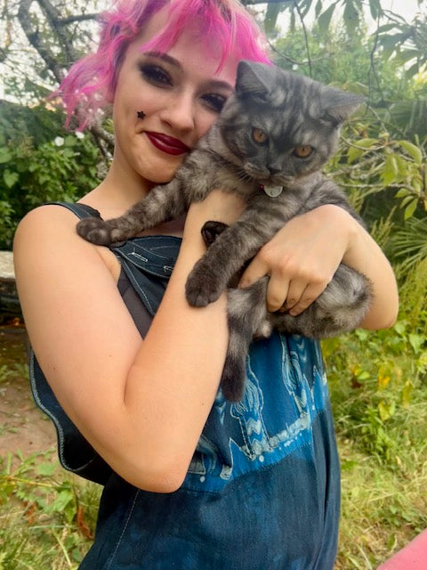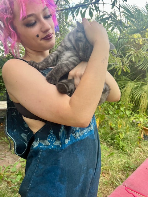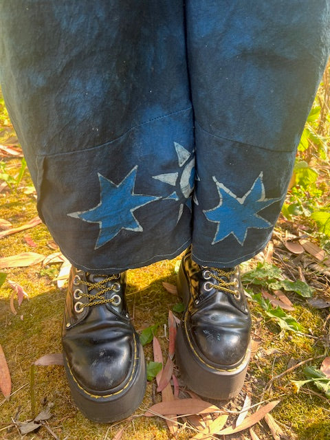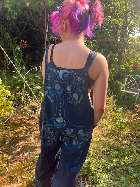 Magical Overalls in BLUES Mystical NIGHT CITY on the front and sides of this overall/jumper with Pockets, on the back a great MOTHER TREE with stretching ROOTS. Stars and Moons on cuffs. Adjustable straps. This is a loose-fitting ONE SIZE fits most mortals. Sizes S- 2XL.