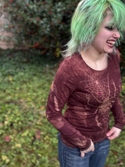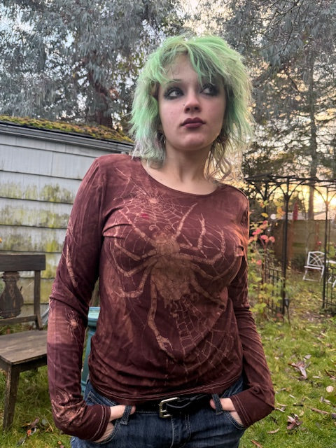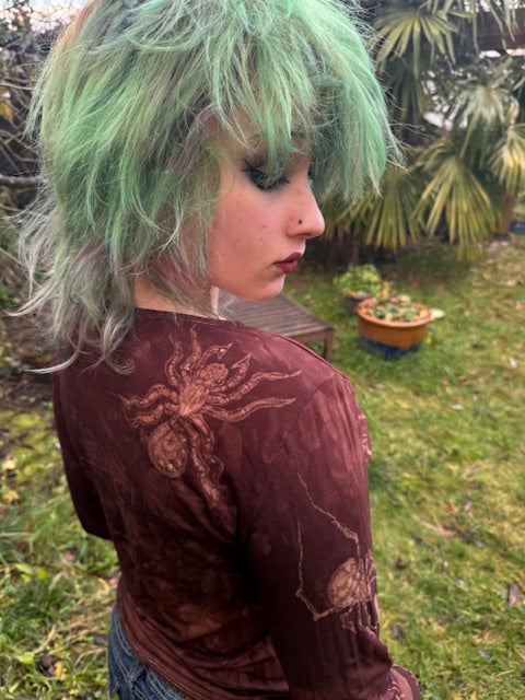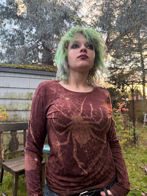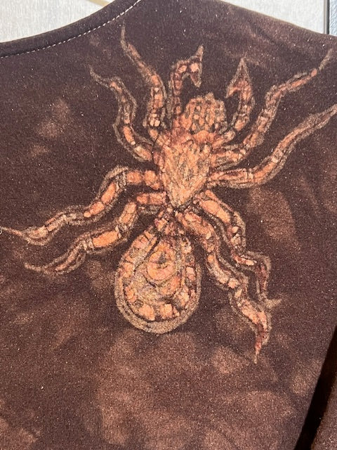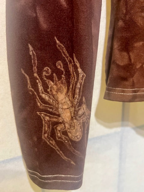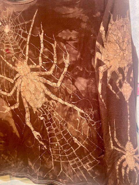 Overcome your fear of the Arachnid with this specially hand painted and richly dyed Brown Spider shirt in the softest material! Brown spiders all over, crawling up your arm, weaving a victim in its coffin web, and your friends will scream at the big tarantula crawling up your shoulder!