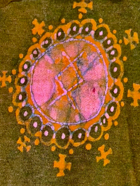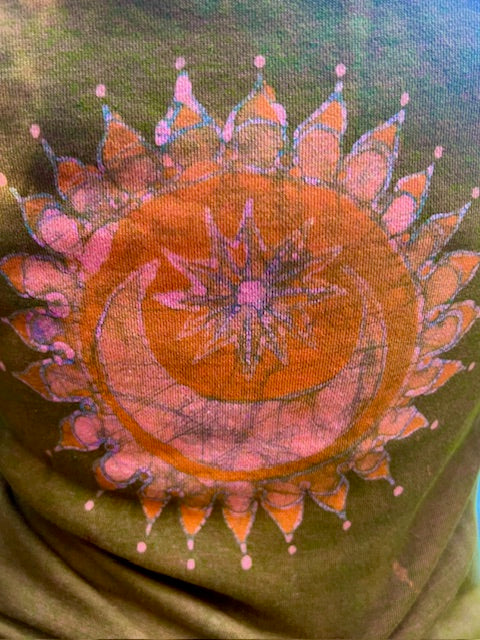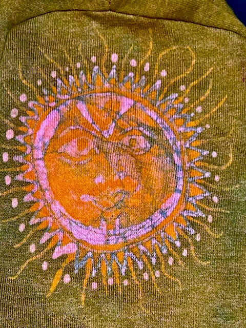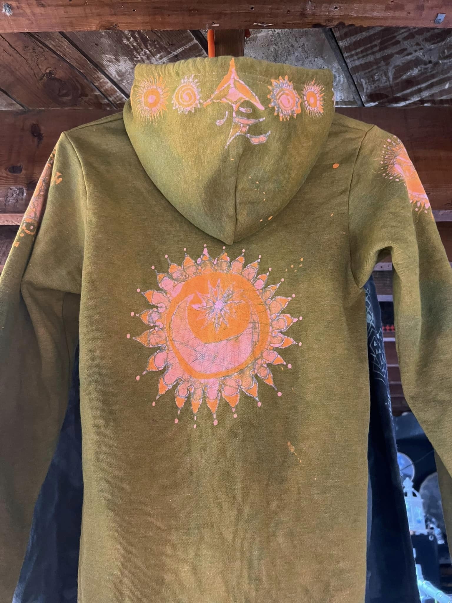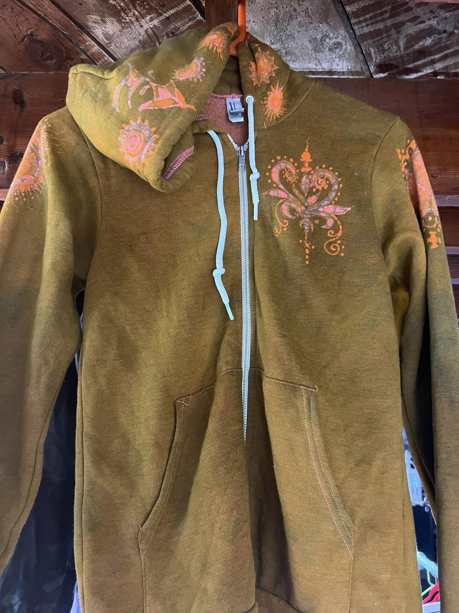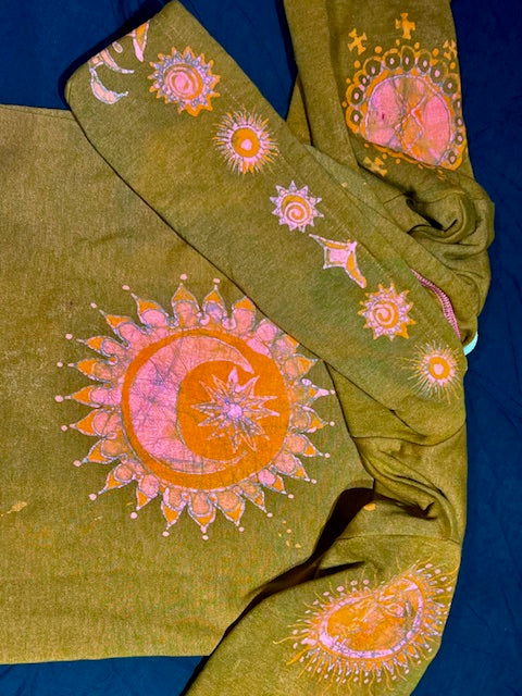 American Apparel brand hoodie hand dyed batik painted in deep gold, pink and orange.