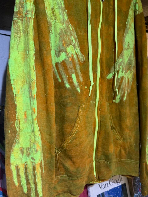 Neon yellow sun, oranges and golds, a matching neon full zipper, Outstretching arms hug you down the sleeves the front of the hoodie and on the hoodie itself! Pockets.