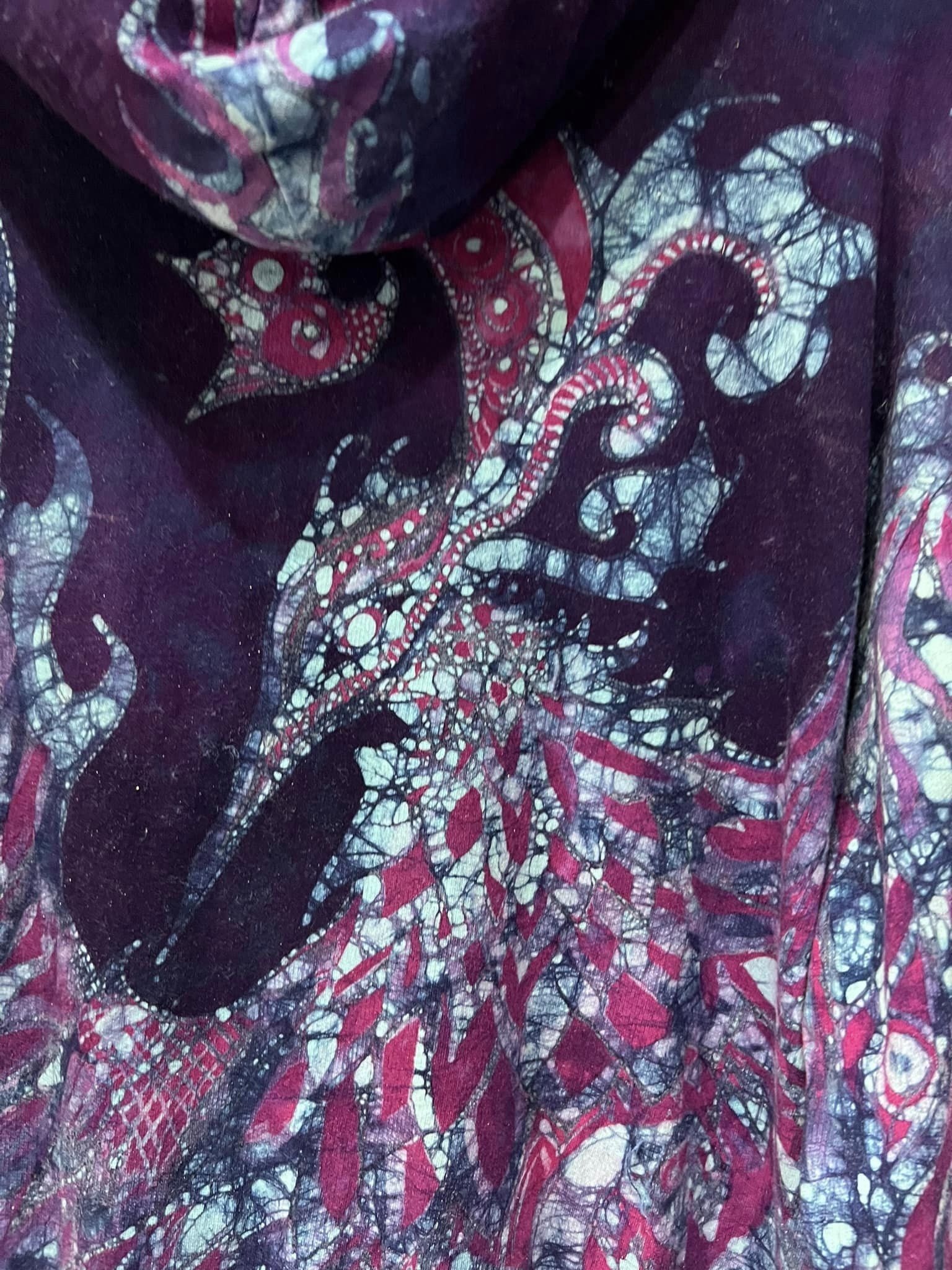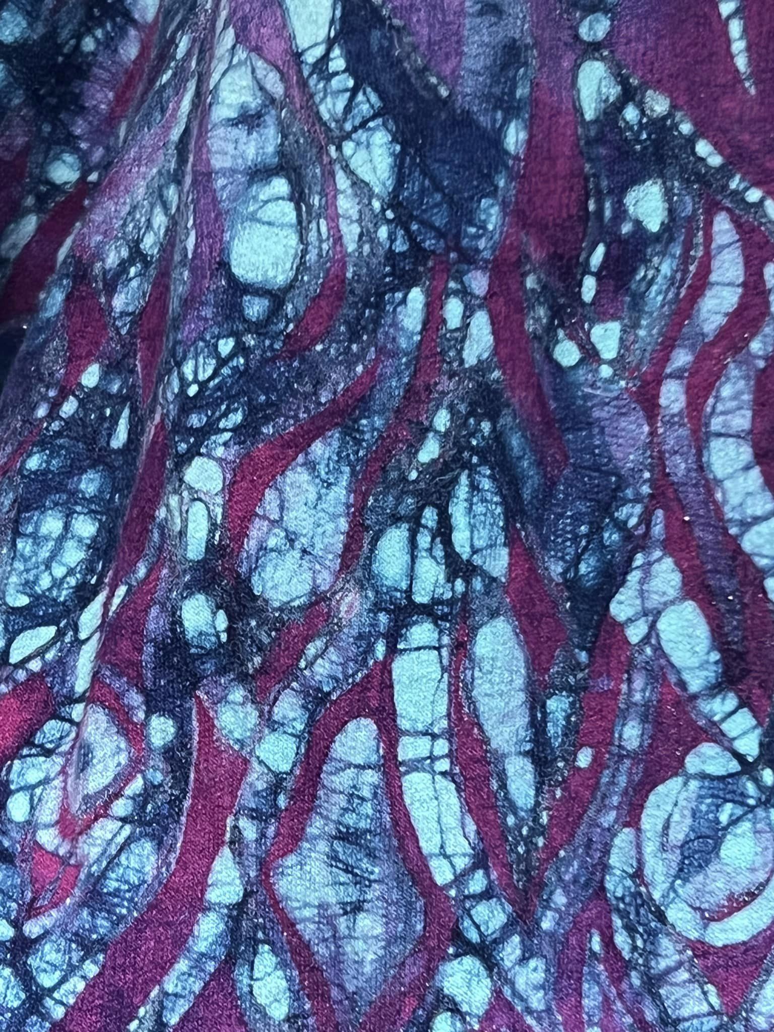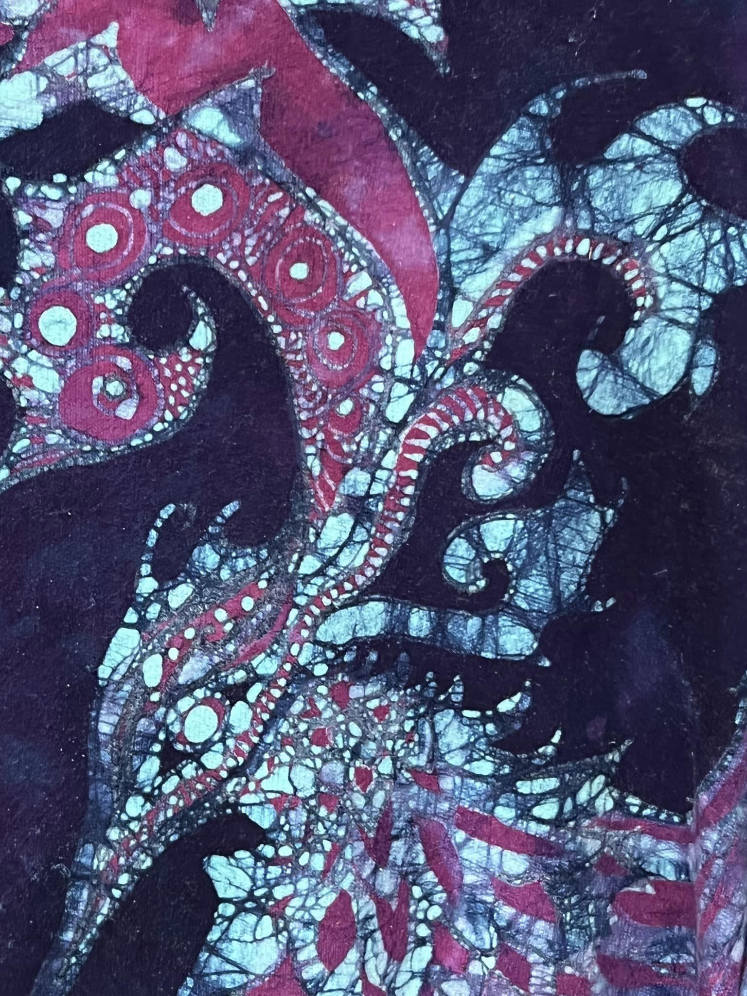 The process of Batik is Painting in Beeswax, Dying in separate Dye baths, adding up to three layers of wax and dye for this amazing piece!