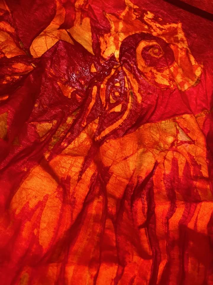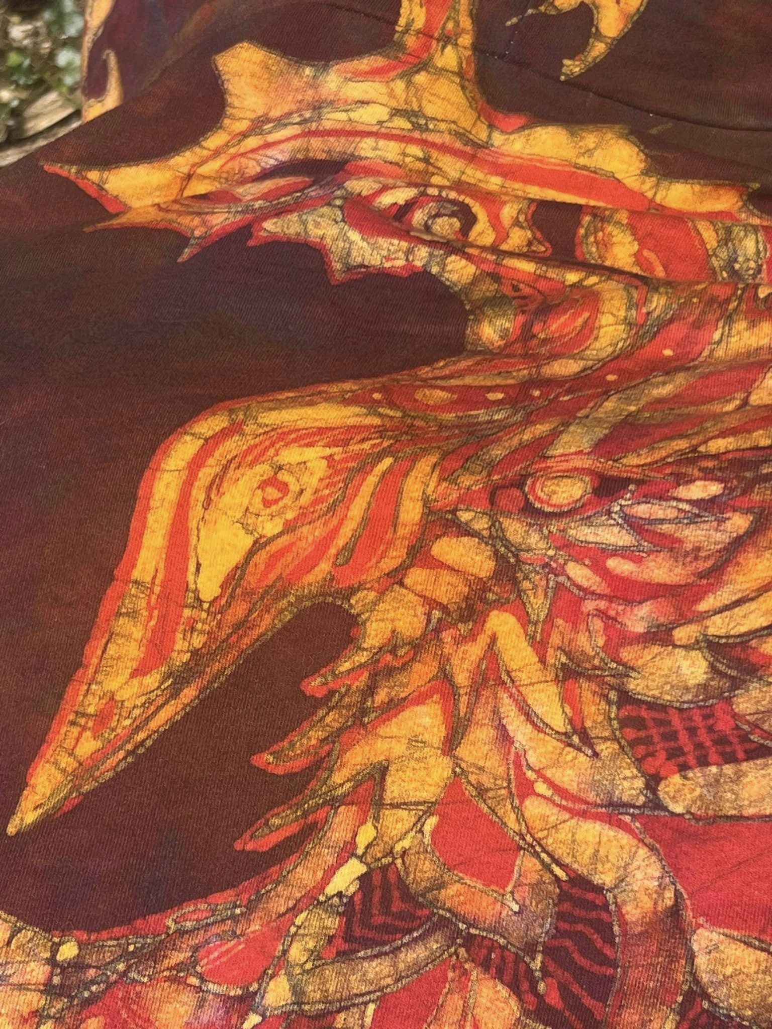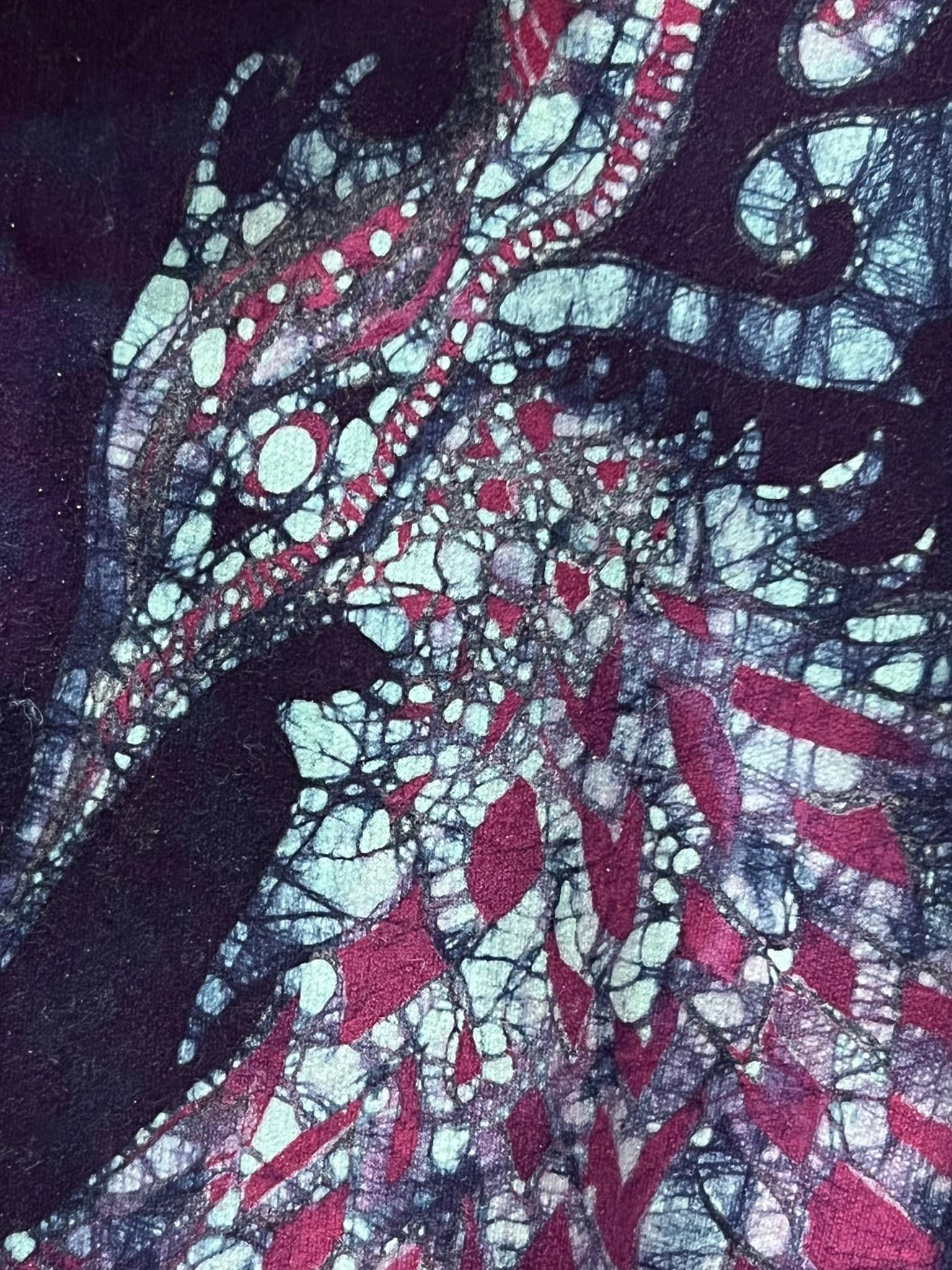 The process of Batik is Painting in Beeswax, Dying in separate Dye baths, adding up to three layers of wax and dye for this amazing piece!