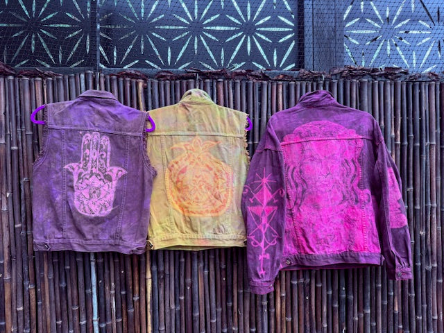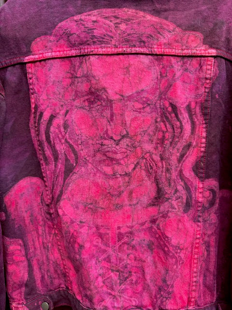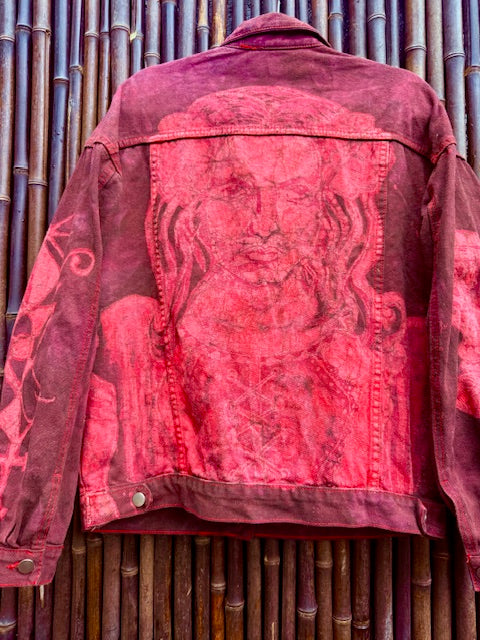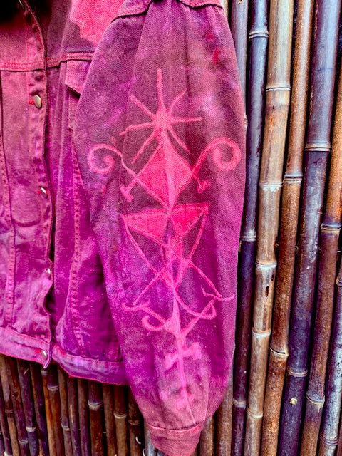 This exclusive One of a Kind "Pomba Gira" denim jacket is for protection, passion and rebellious creativity! Pomba Gira is revered as the spirit of sensuality in Afro-Brazilian culture, she is love, freedom and transformation. She is often seen wearing black and red dress, smoking a cigarette and drinking a glass of red wine, often she has red flowers in her hair. The jacket embodies all her sacred elements beginning with a portrait of her on the back, her hand holding a cigarette under the sleeve and the goblet of wine on one sleeve and her sigil on the other. This coat has six pockets! Four on the outside and two hidden on the inside. It will fit all the things; keys, glasses, phone, lipstick and all the things you need to go out and purse free - great for forest festivals, beach parties and barbecues!